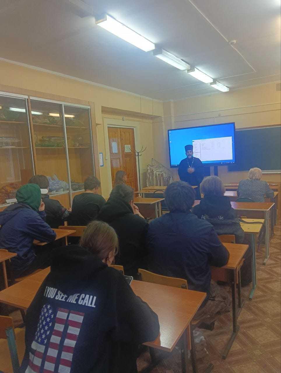 14 ноября в Дмитровском Рыбохозяйственном Технологическом институте в п. Рыбное прошёл урок посвященный Дню Единства. Настоятель Покровского храма с. Жестылево иерей Александр Юденко показал студентам документальный фильм о защите Родины и провёл духовную беседу о патриотизме.